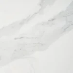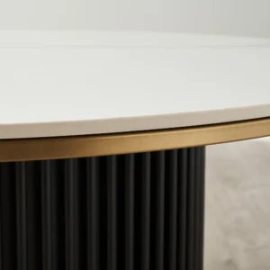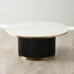 The Archie White Sintered Stone Round Coffee Table pays homage to the art-deco era with a pristine white sintered stone top featuring subtle marbled veining. Its stainless steel base, adorned with vertical reeding, captures the geometric elegance of the 1920s.