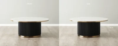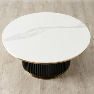 The gold accents at the base add warmth and opulence, contrasting beautifully with the cool white stone top and intricate reeded detailing. A functional piece of art, this coffee table combines timeless grandeur with modern sophistication.