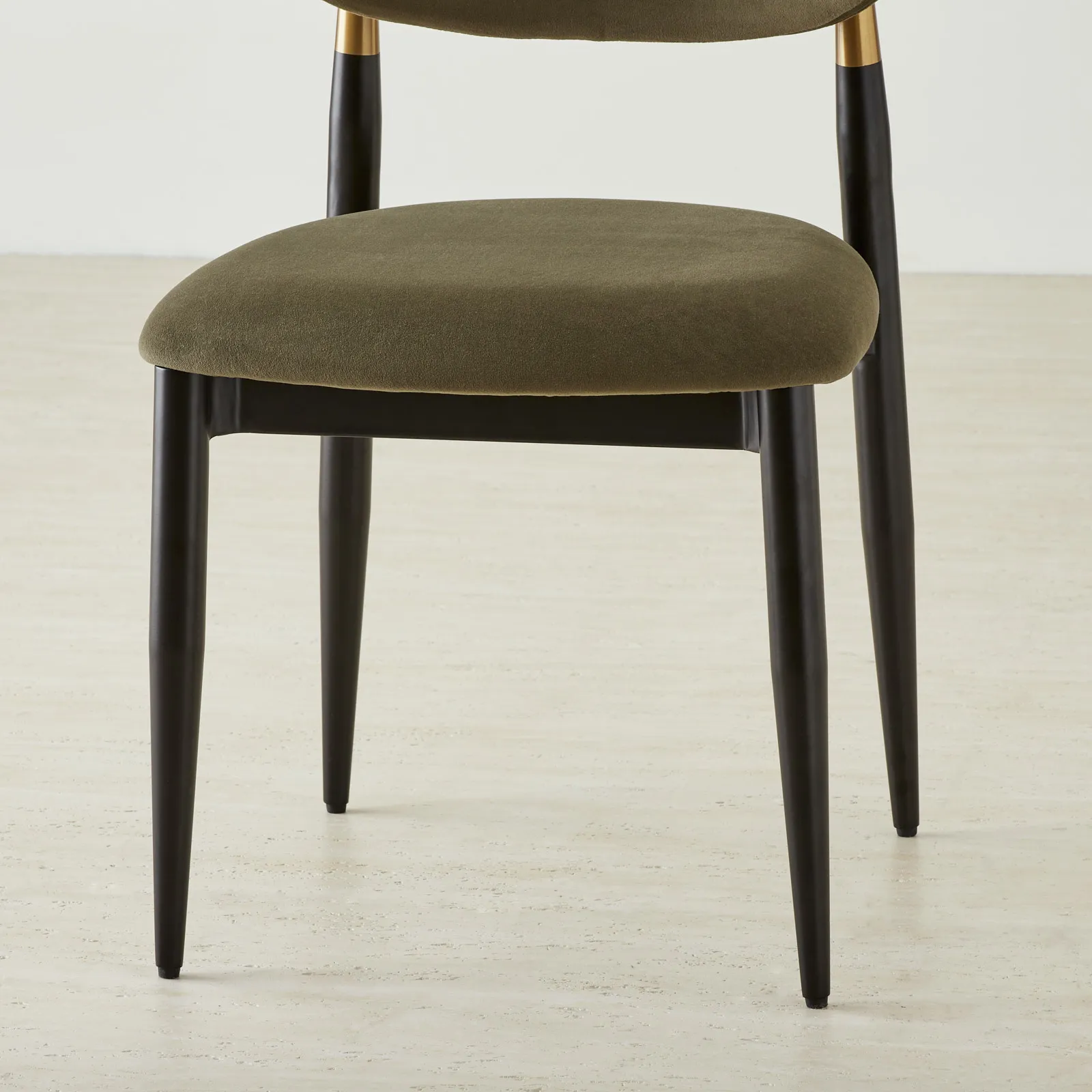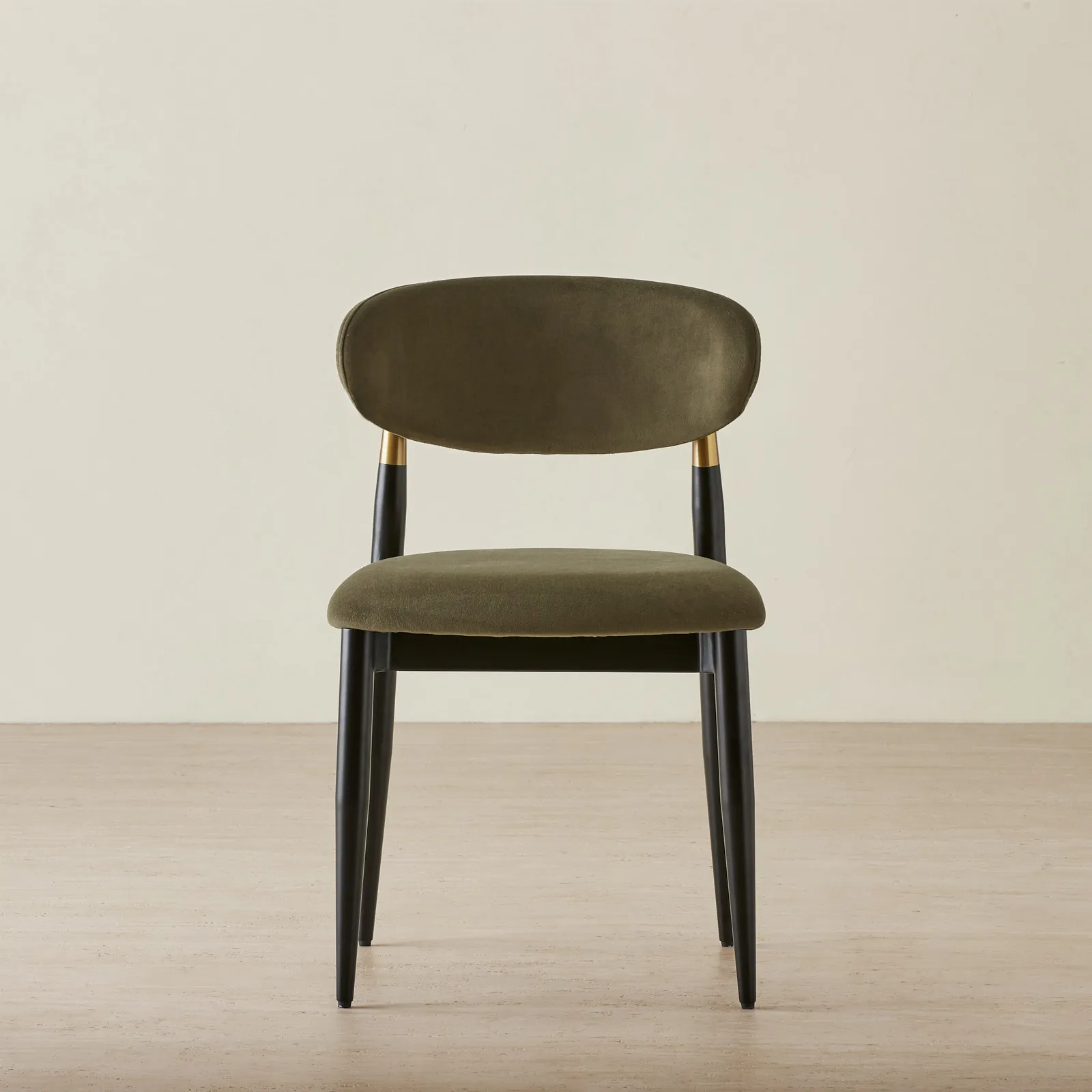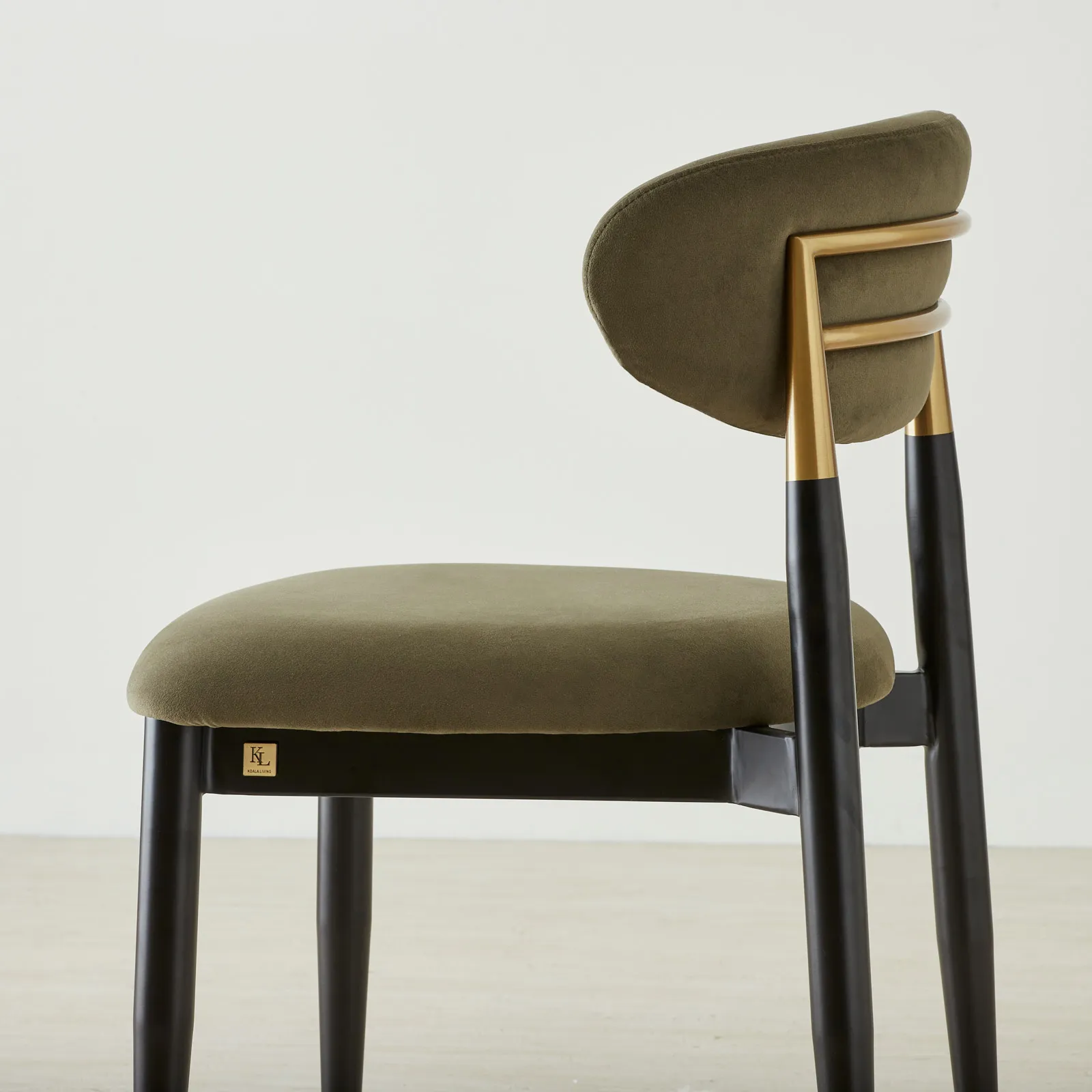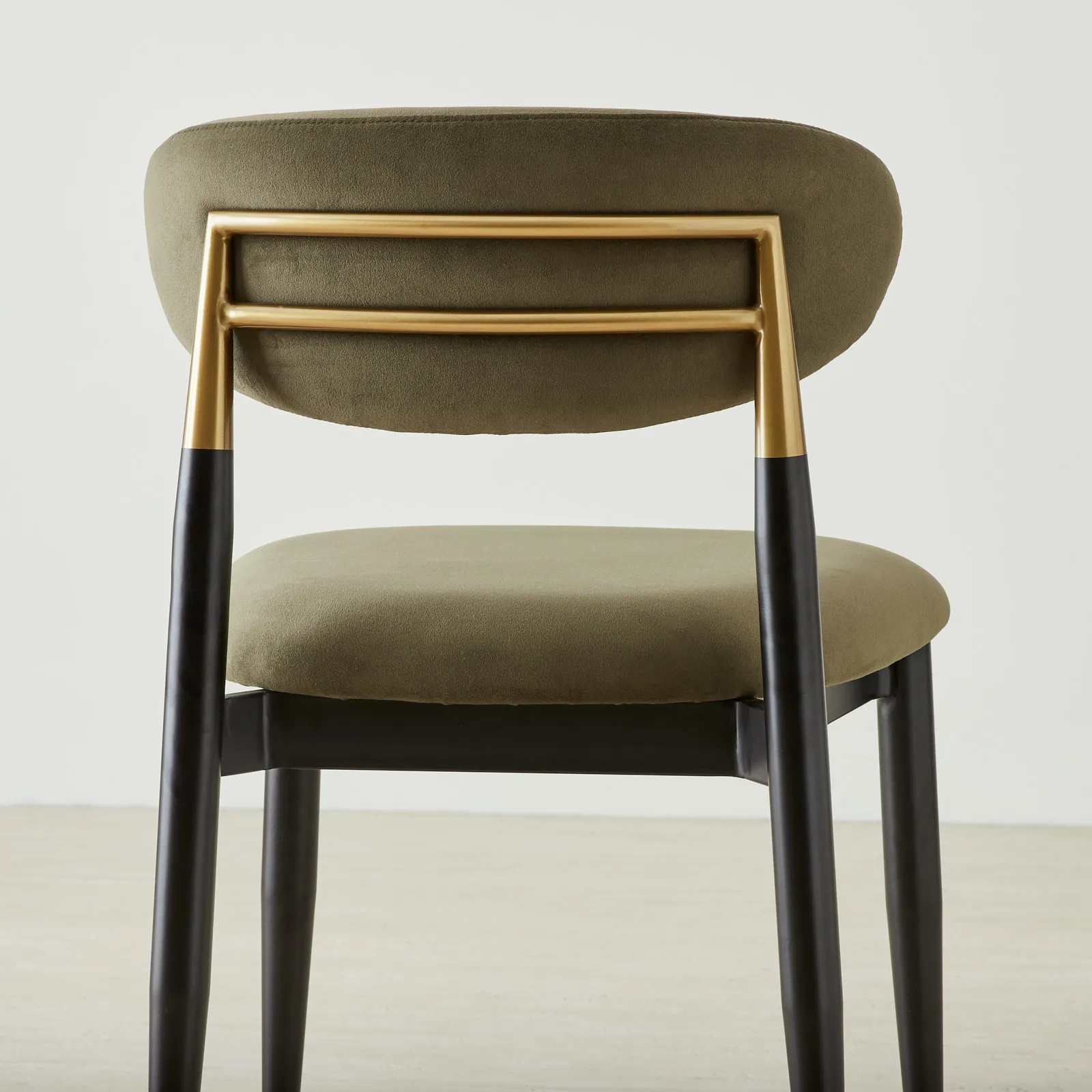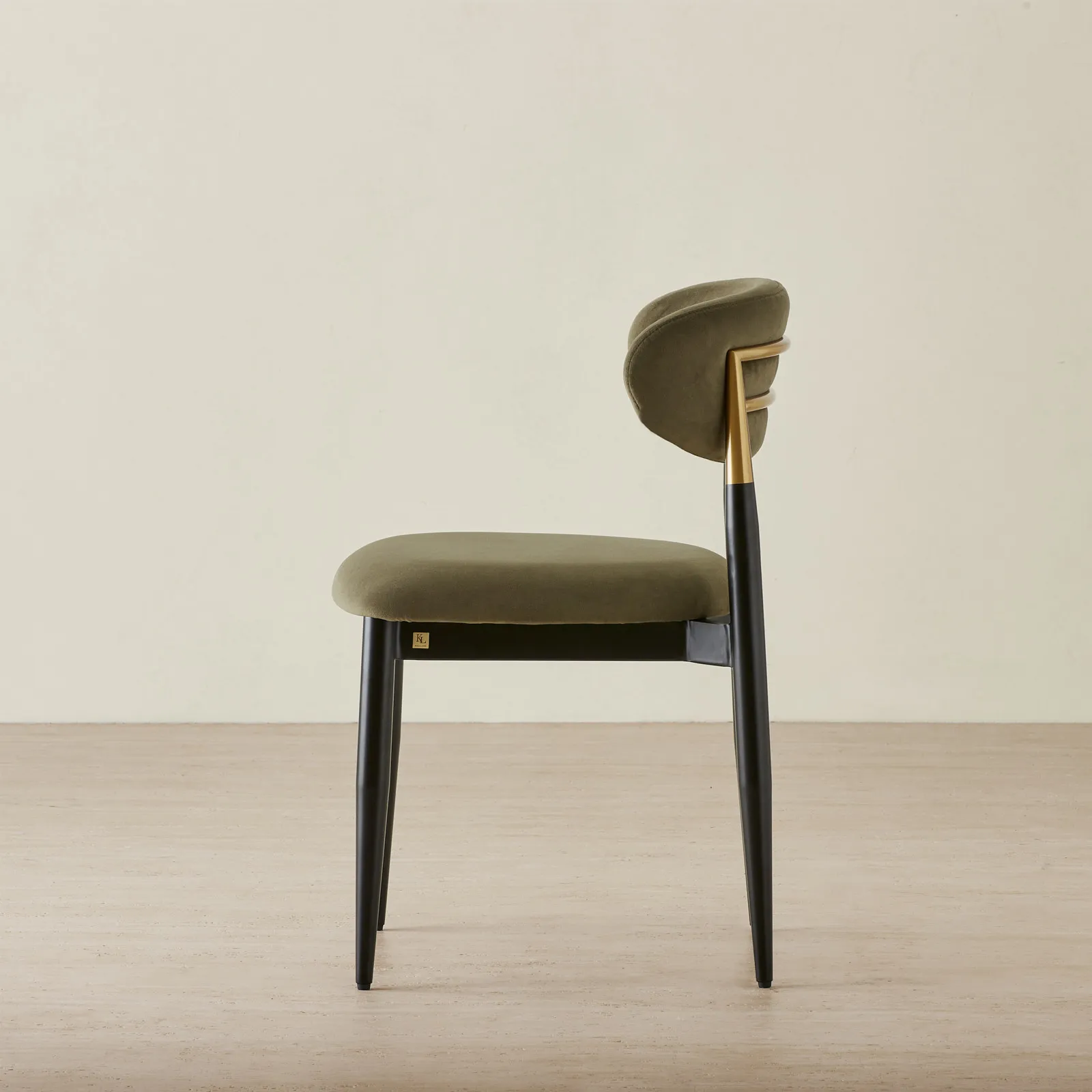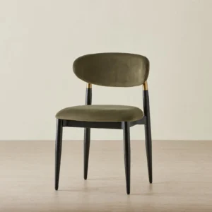 The Amali Olive Green Velvet Dining Chair features soft, luxurious velvet upholstery for a rich, modern look. Its cushioned seat and curved backrest ensure lasting comfort during meals or gatherings.