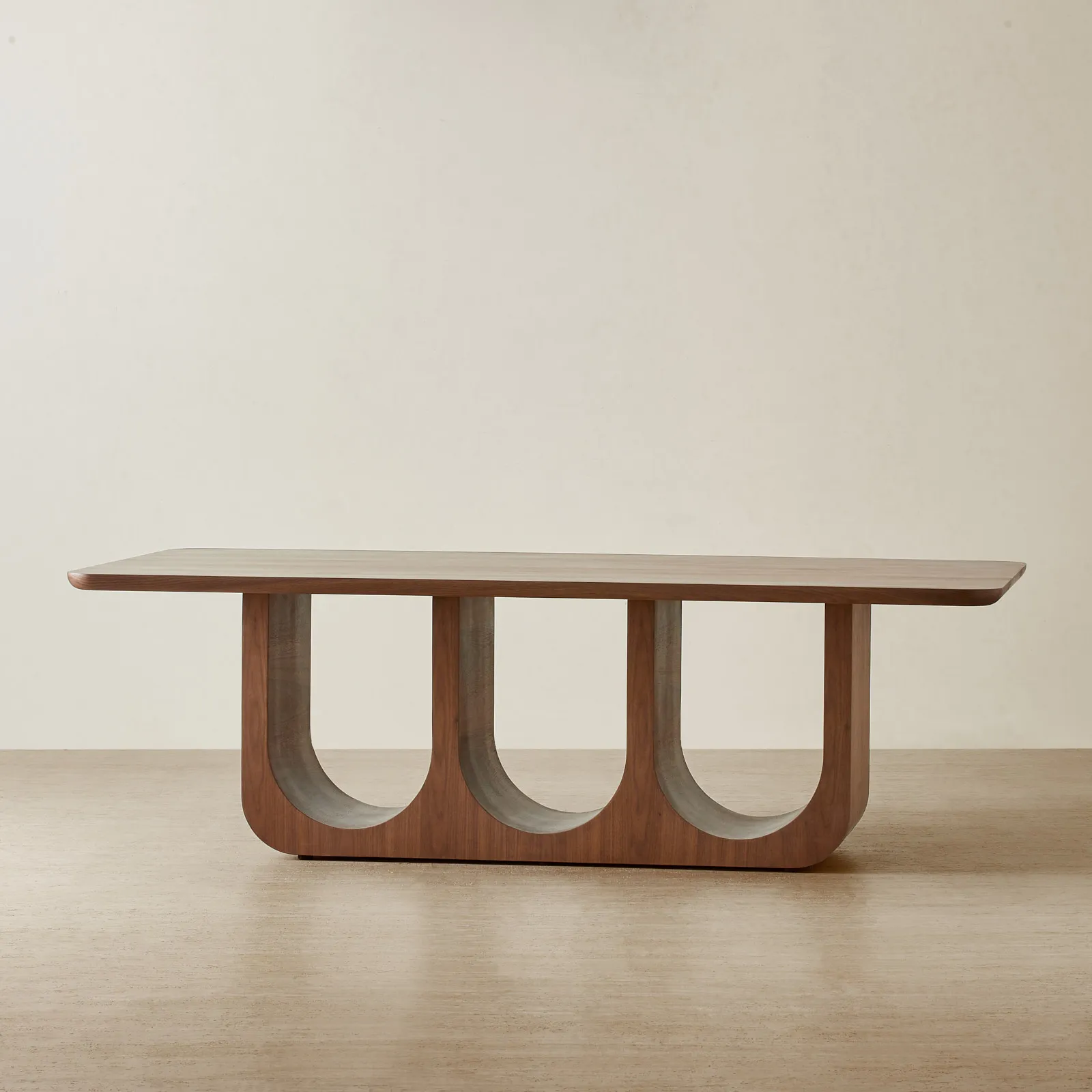 Warmth flows through the rich mocha walnut veneer of the Costanza Dining Table. Its natural grain and tone bring quiet depth to every meal. Its broad 240cm surface rests on a trio of sculptural arches.