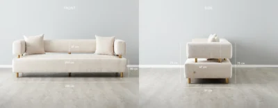 Chenille fabric is upholstered on its crafted wooden frame, offering a soft, textured feel. The sofa’s halves are separated by stainless steel columns in bright gold.