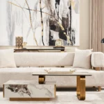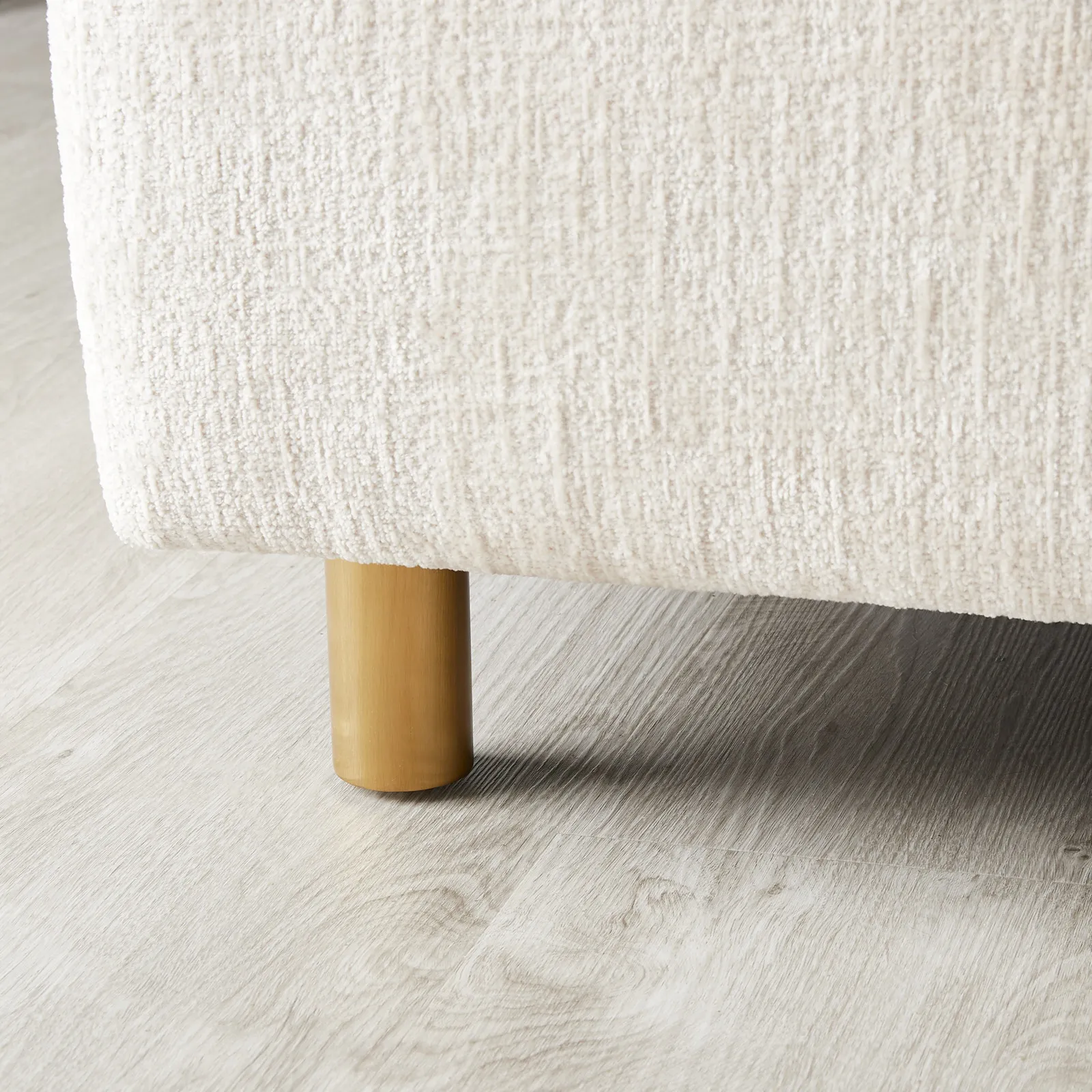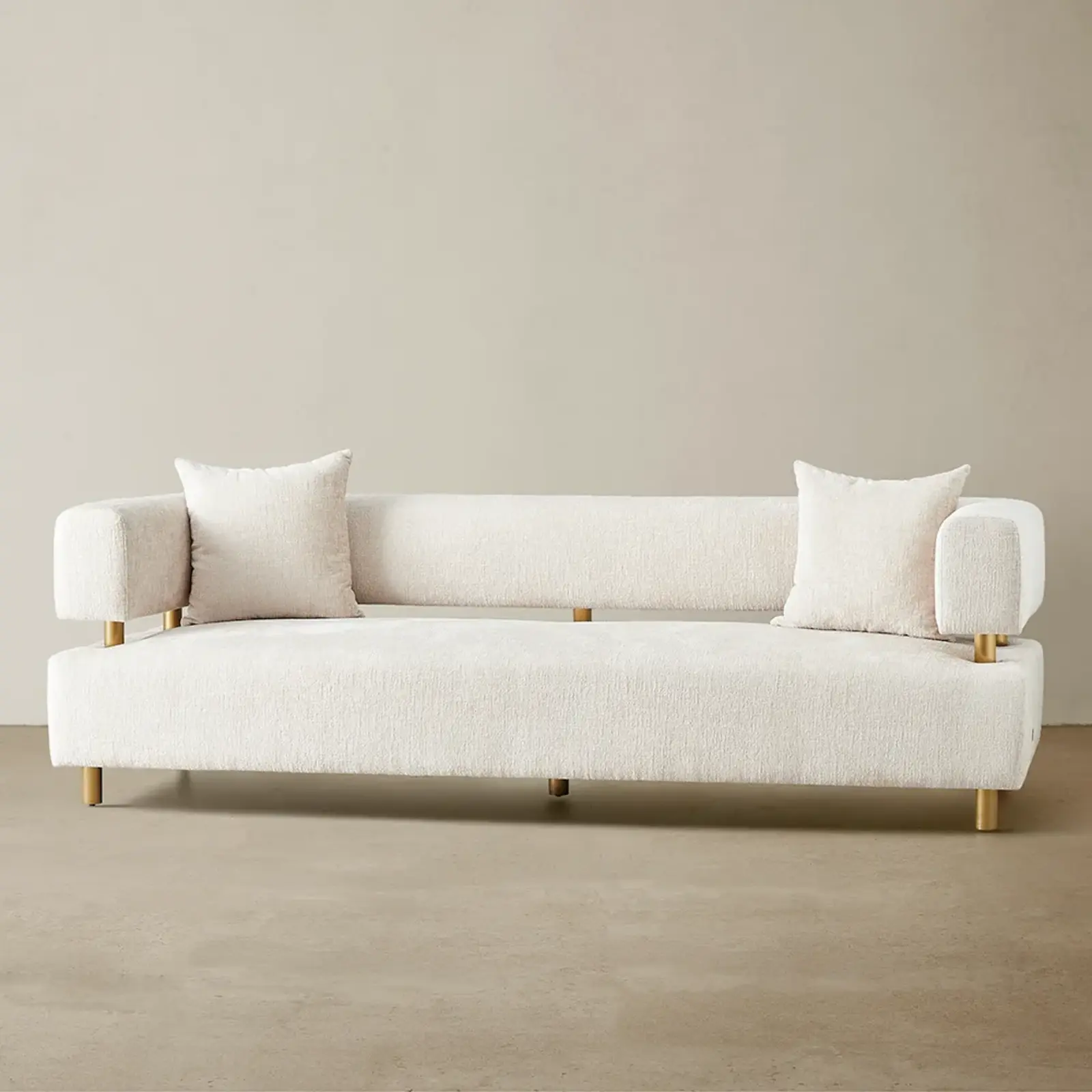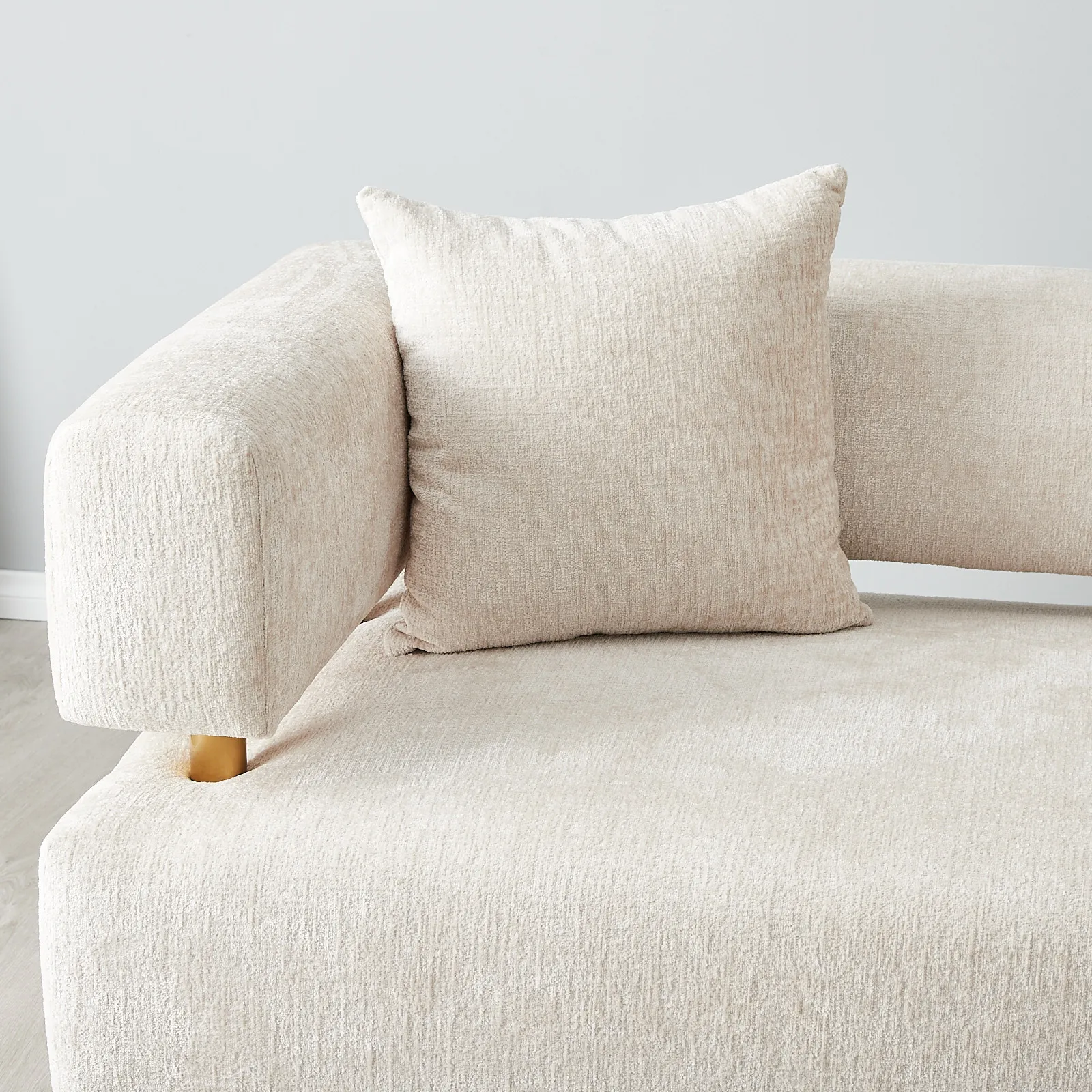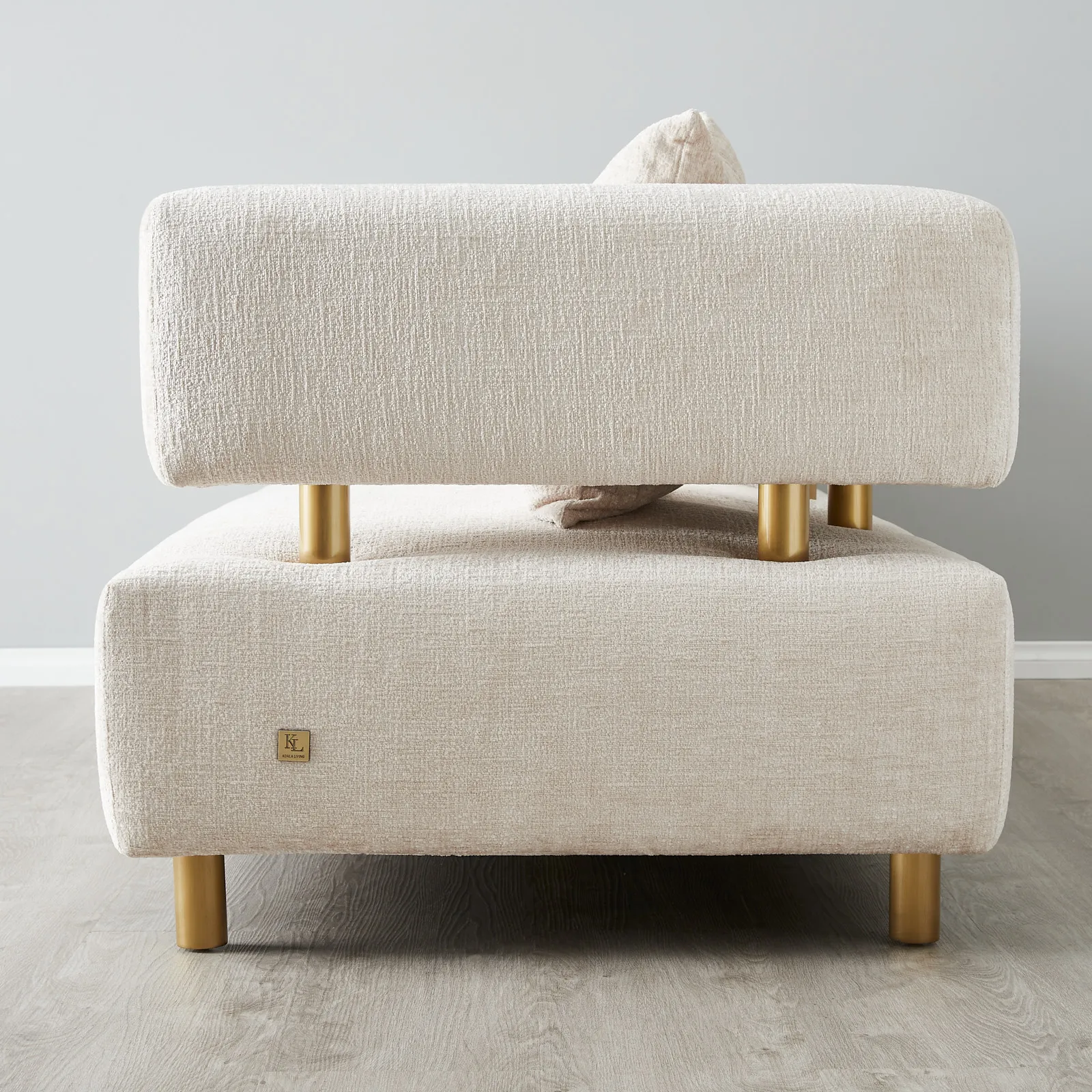 Chenille fabric is upholstered on its crafted wooden frame, offering a soft, textured feel. The sofa’s halves are separated by stainless steel columns in bright gold.