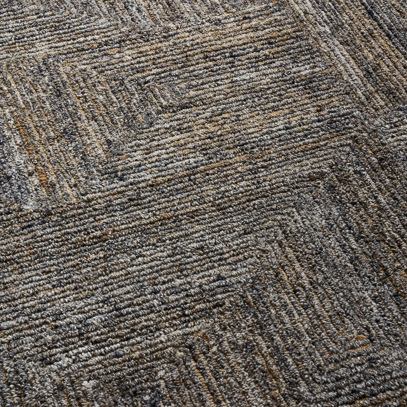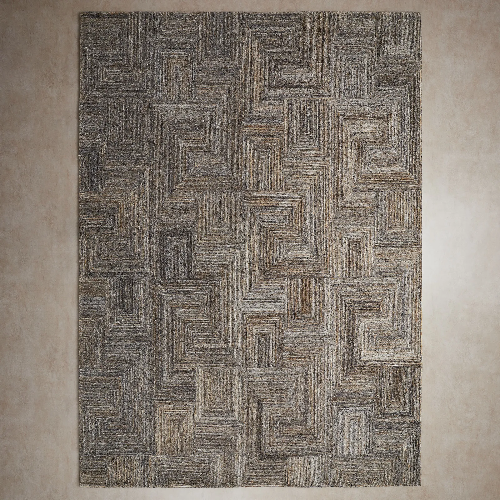 The Messina Sponge Floor Rug features a captivating geometric design with interlocking squares and rectangles, adding depth and texture.
