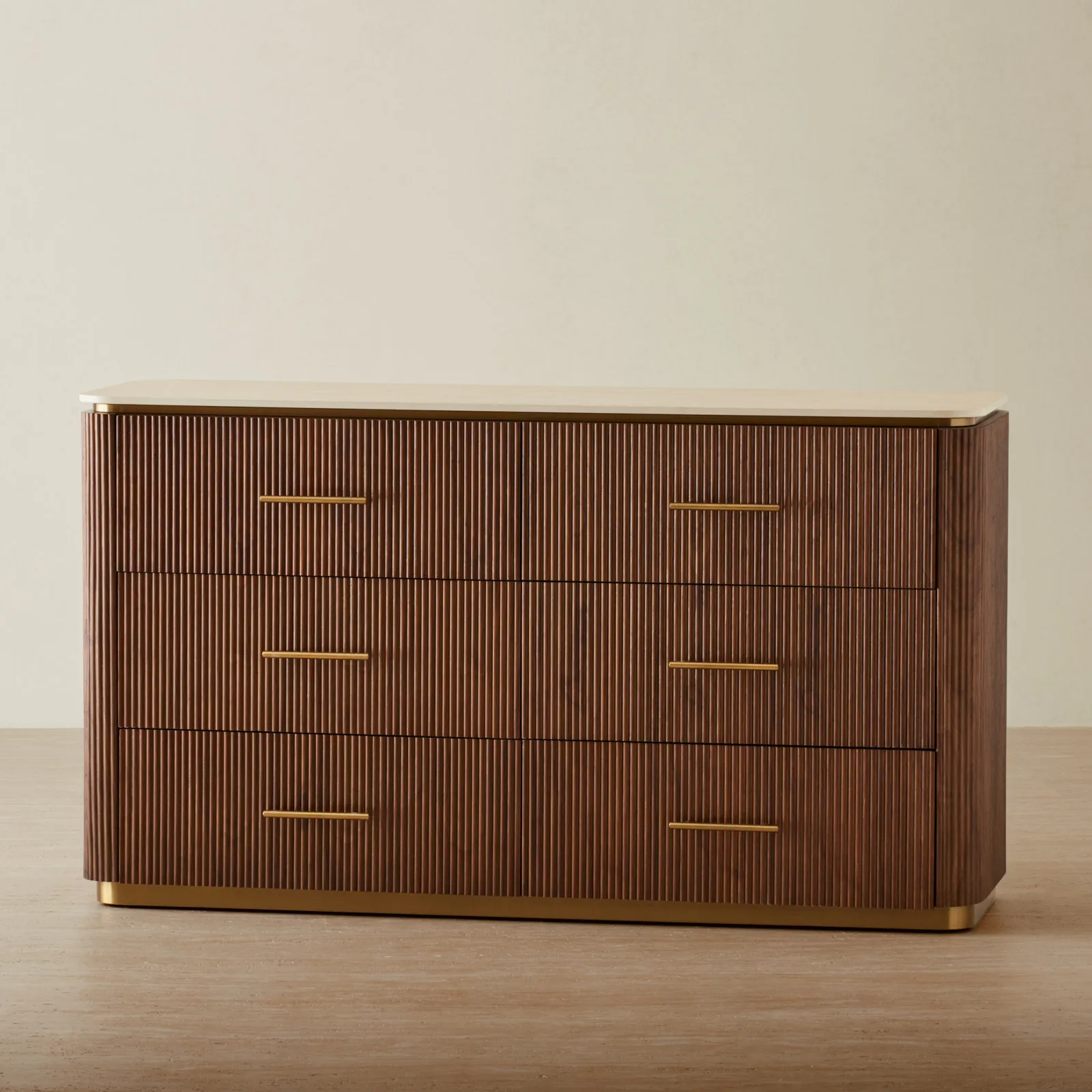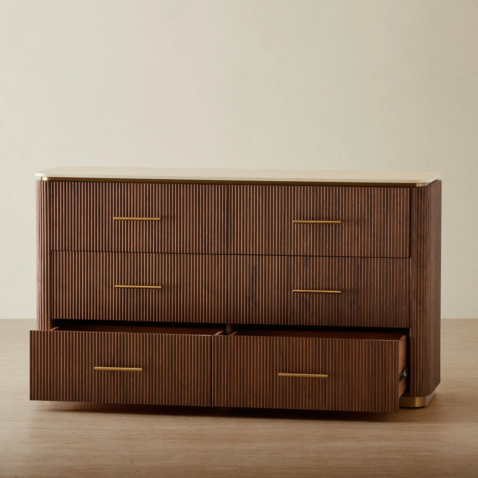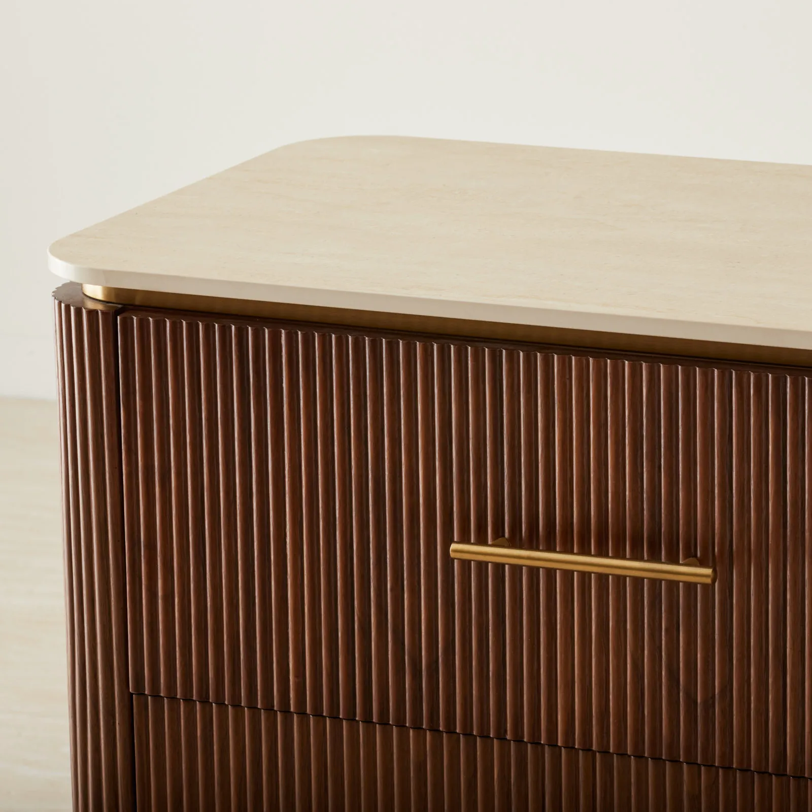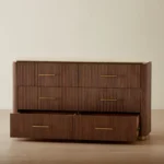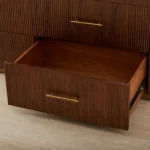 Its walnut veneer features vertical reeding, adding a gentle rhythm and texture. With roomy drawers, it’s perfect for storing everything from cozy sweaters to keepsakes.