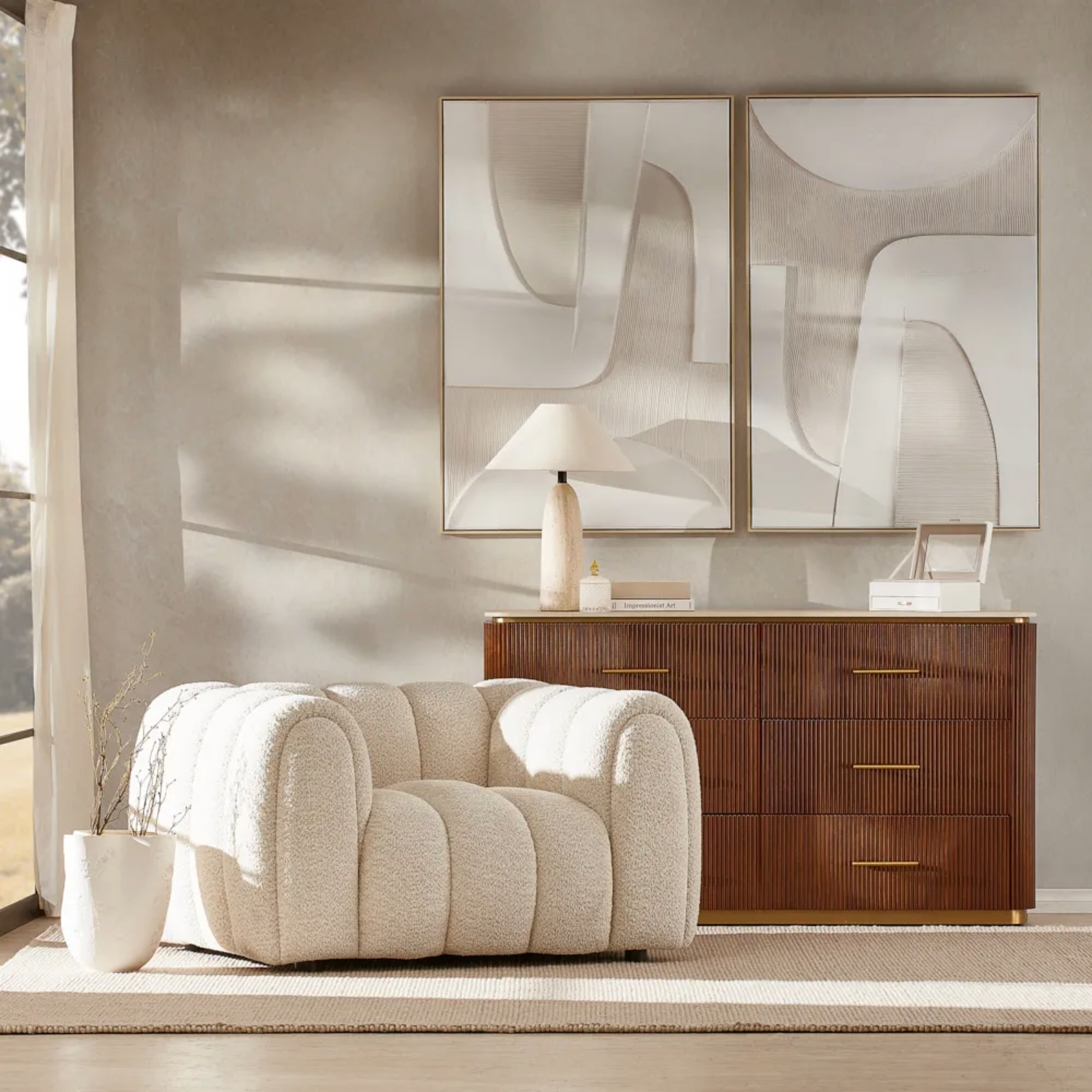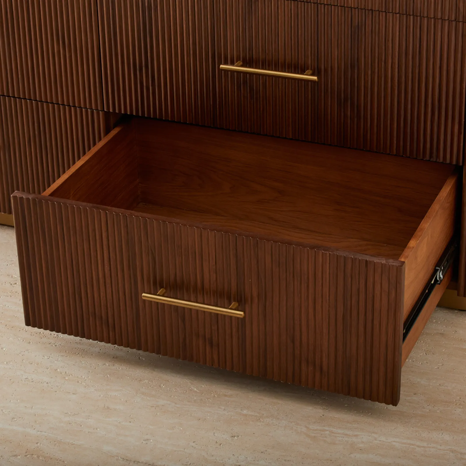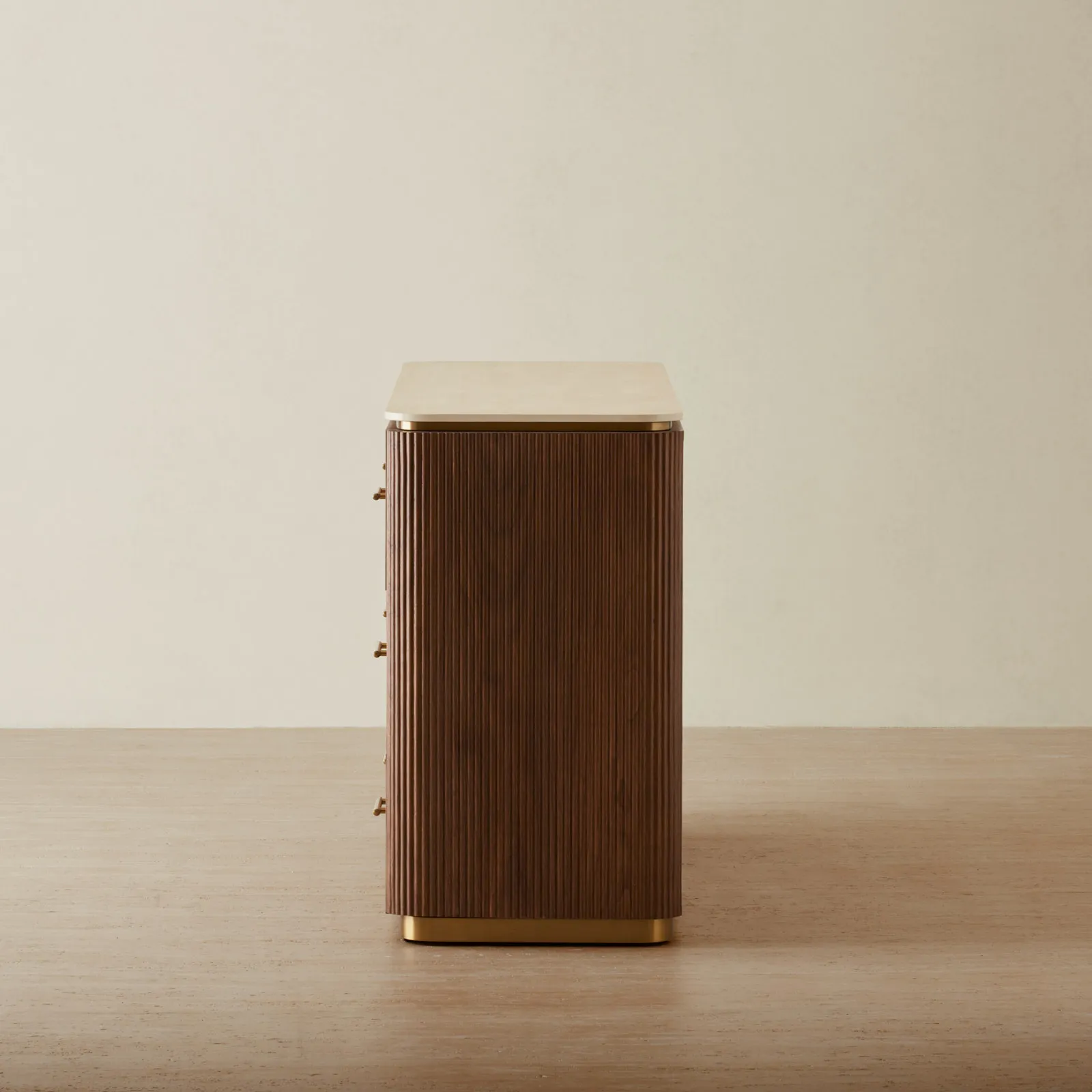 Its walnut veneer features vertical reeding, adding a gentle rhythm and texture. With roomy drawers, it’s perfect for storing everything from cozy sweaters to keepsakes.