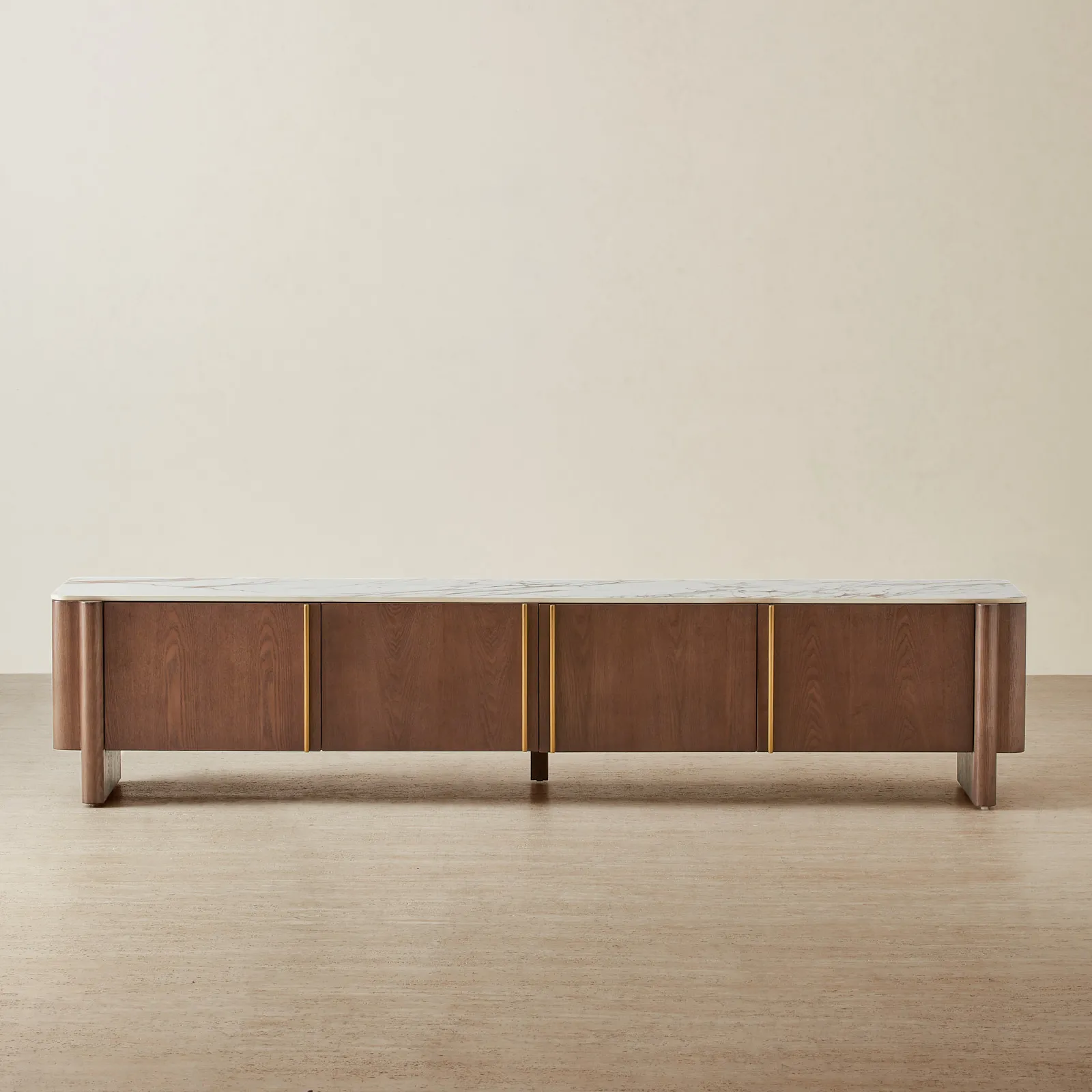 Brass-toned accents flow between each panel, adding a subtle rhythm while concealing generous compartments designed for media storage and cable management.